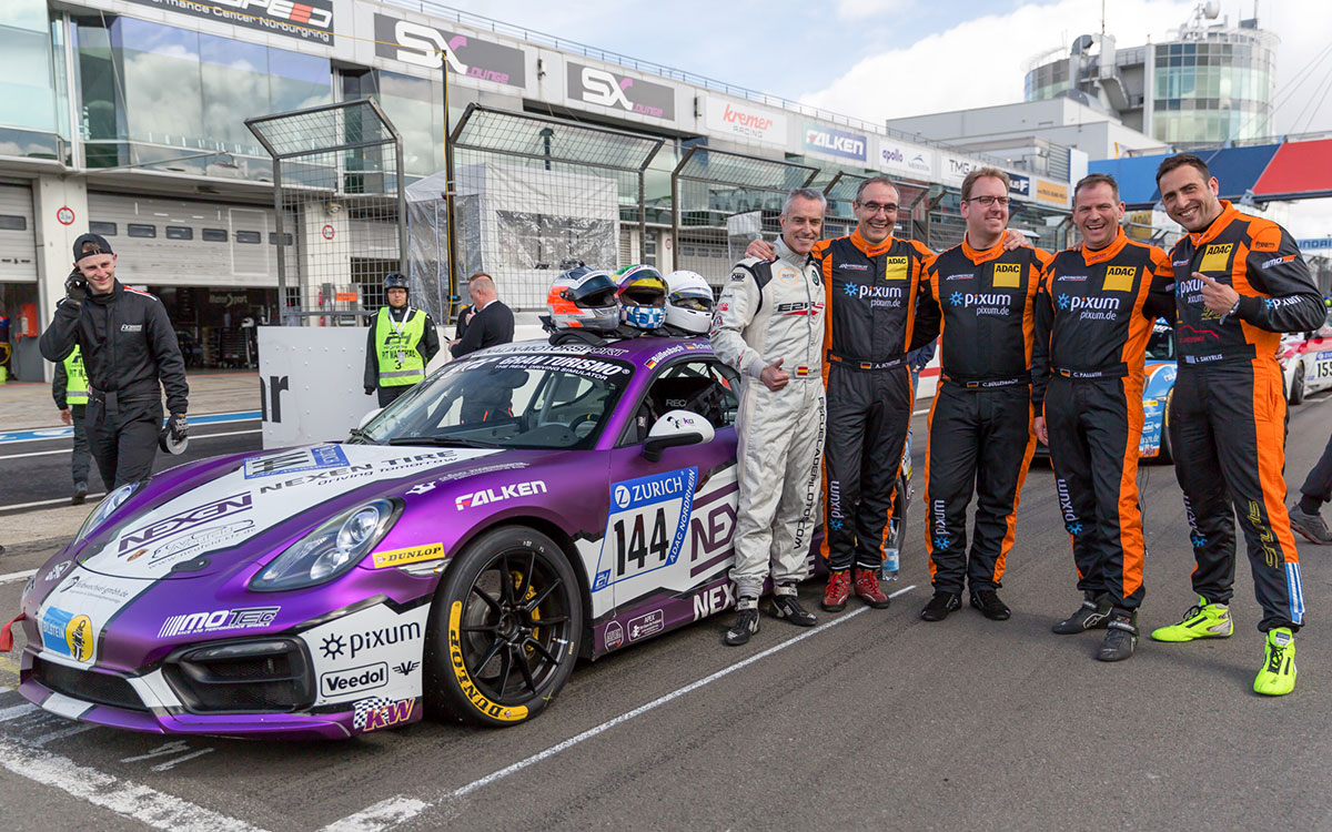 Erfreulich war auch das Abschneiden des PIXUM Team Adrenalin Motorsport in der Produktionswagenklasse V5. Hier herrschte nach Ablauf der sechsstündigen Renndistanz gleich doppelt Grund zur Freude. Während Christian Büllesbach, Andreas Schettler, Ioannis Smyrlis und Carlos Arimon mit dem Nexen Porsche Cayman auf den zweiten Rang fahren konnten, gelang auch dem Schwesterfahrzeug dem Pixum Cayman der Sprung auf das Podium.  Hier teilten sich Urs Zünd, Christian Teichert, Daniel Attallah und Carsten Palluth die Lenkradarbeit. „Unsere beiden Porsche Cayman sind wieder wie ein Uhrwerk gelaufen und die Piloten haben auf der Strecke allesamt einen fehlerfreien Job gemacht. Die Plätze zwei und drei in der Klasse V5 runden unser tolles Teamergebnis beim Qualifikationsrennen ab. Nun schauen wir voller Vorfreude auf das 24h Rennen“, so Unger.