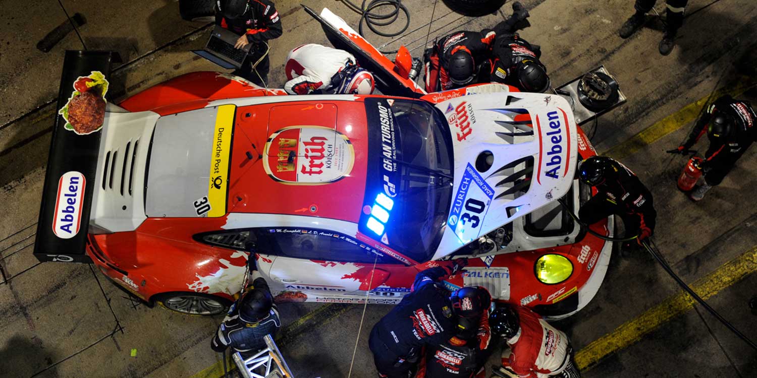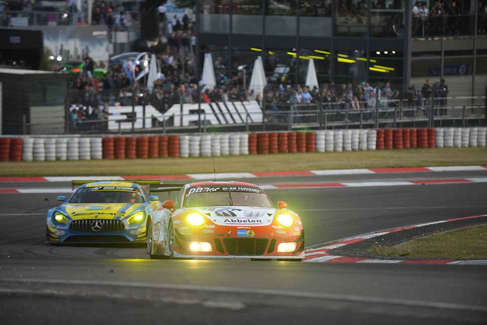 Matt Campbell nimmt das Rennen aus der 17. Startposition auf und spult einen taktisch klugen und schnellen Stint ab. Als er nach sechs Runden an Wolf Henzler übergibt, ist er bereits wieder in den Top 12. Kurz bevor der Nürtinger nach dem 14. Umlauf an Alex Müller weiterreicht, wird er in einer Code-60-Zone von einem Hintermann touchiert – ohne nennenwerte Folgen. Müller fährt einen Achtrunden-Turn ohne Zwischenfälle, dann ist um 18.50 Uhr erstmals Lance David Arnold an der Reihe. Nach 30 Runden auf der Nordschleife kehrt Campbell ins Cockpit zurück und liegt auf Rang 13. Er ist Elfter, als er um 21.20 Uhr von Wolf Henzler abgelöst wird. Auch der Schwabe spult acht Runden ab und gibt nach 46 Umläufen an Müller und der im gleichen Rhythmus an Arnold weiter. Es ist fast 1.00 Uhr morgens, als nach 62 Runden Campbell wieder für acht Umläufe ins Cockpit klettert. Danach fährt Henzler zunächst auf Trocken-Pneus los, kommt aber nach Runde 72 an die Box und holt sich aufgrund starker Niederschläge Regenreifen ab – der Beginn einer sehr feuchten und ungemütlichen Nacht. Dies erleben auch Müller (ab Runde 82), Arnold (ab Runde 90) und Campbell (ab Runde 98), der in die Morgendämmerung fährt. Um 8.49 Uhr übernimmt Henzler den 911 GT3 R auf abtrocknender Strecke noch einmal mit Regenreifen. Nach Runde 106 erhält er Trockenpneus, dann beginnt es wieder zu schütten und Henzler kehrt im 111. Umlauf zurück auf Regenreifen. In Runde 119 setzt sich Müller in den Porsche, der Platz acht belegt. Doch er kommt nicht weit: Die Rennleitung unterbricht das Rennen um 11.45 Uhr nach 122 Umläufen für das Frikadelli-Auto wegen dichten Nebels. Der Restart in die Formationsrunde erfolgt um 13.45 Uhr mit Matt Campbell am Steuer. Um 15.25, fünf Minuten vor Ablauf der 24-Stunden-Frist, musst der Australier nach 131 Runden noch einmal die letzten Liter Benzin nachfüllen und überquerte die Ziellinie auf Rang elf.