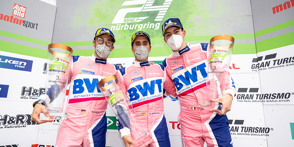 06.06.2021 Großer Erfolg für das Mercedes-AMG Team GetSpeed: Beim ADAC TOTAL 24h-Rennen auf dem Nürburgring fuhren Maximilian Götz, Daniel Juncadella und Raffaele Marciello als bestes Mercedes-AMG Team auf Platz drei. Jules Gounon, Fabian Schiller und Matthieu Vaxiviere wurden im zweiten Mercedes-AMG des Teams Siebte. Das gute Gesamtergebnis von GetSpeed in einem außergewöhnlichen Langstreckenrennen auf dem Eifelkurs komplettierten Janine Shoffner, Moritz Kranz, Markus Palttala und Maxime Soulet auf Rang 14 als viertbestes Pro-Am-Team.