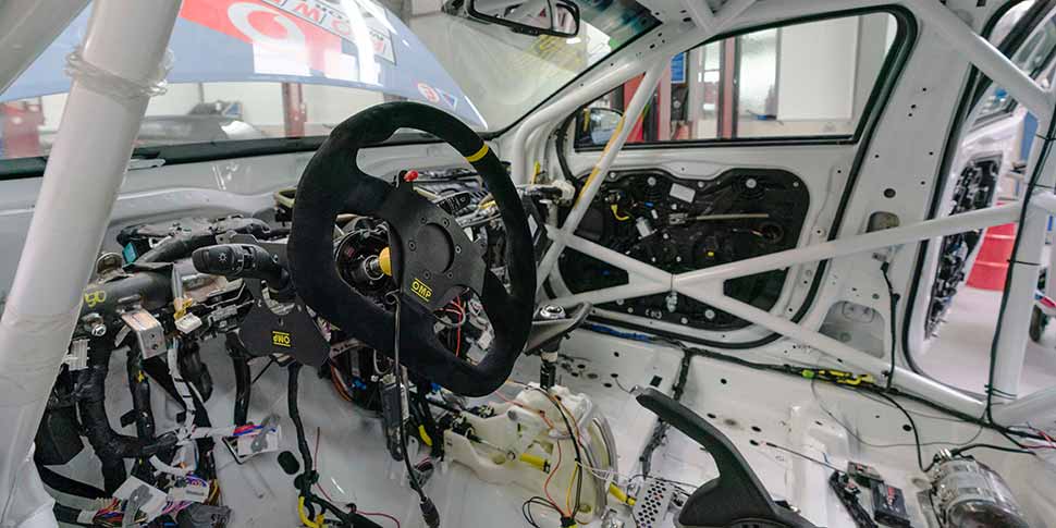 Einer der ersten Schritte beim Aufbau des Tourenwagens war der Einbau eines Überrollkäfigs aus hochfestem Stahlrohr bei Wiechers Sport. Zudem wurde das Fahrzeug mit einem 80-Liter-FIA-FT3-Sicherheitstank, einer Feuerlöschanlage und einem speziellen Rennsitz ausgerüstet. Um Gewicht zu sparen und die Brandgefahr zu verringern, verzichtet die Rennversion auf die Seriensitze, Tür- und Deckenverkleidungen. Bei der Konzeption des Fahrzeugs wurde auch auf die einfache Bedienbarkeit großer Wert gelegt. Rosenkranz: „Diese sollte möglichst intuitiv erfolgen können, damit die Piloten während des Rennens nicht zu sehr abgelenkt werden und sich auf das Fahren konzentrieren können. Wir haben dabei auf unsere langjährige Erfahrung zurückgegriffen und uns intensiv mit den Fahrern ausgetauscht. Dabei konnten wir von der riesigen Nordschleifen-Routine von Franz Engstler profitieren. Das war beim Aufbau des Autos viel wert. Ein wichtiger Punkt war zum Beispiel die Beleuchtung für den Nachteinsatz. Hier war das Feedback sehr wichtig, um die zusätzlichen Scheinwerfer perfekt einzustellen.“
