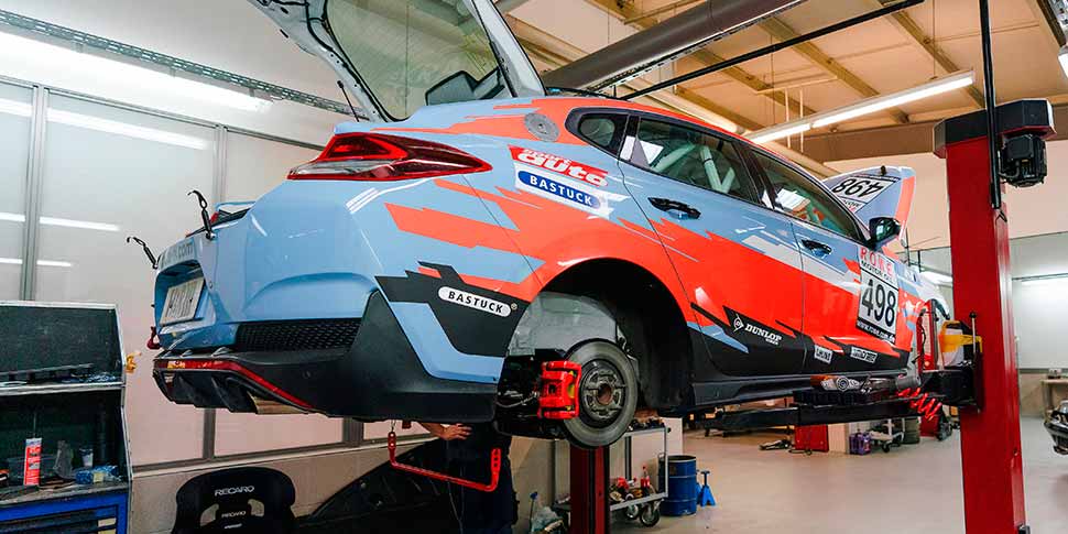 Der Aufbau des Tourenwagens begann Anfang März mit der Anlieferung einer Rohkarosserie. Als Teilespender diente eine Straßenversion des Hyundai i30 Fastback N. „Das Serienfahrzeug bietet dank seines Konzepts eine ideale Basis für die Rennversion. Da diese in der Klasse V2T für seriennahe Fahrzeuge mit einem Hubraum von 1.600 bis 2.000 ccm und Turbolader antritt, haben wir sehr viele Teile übernehmen können“, sagt Ronny Rosenkranz, der Projektleiter Technik für das 24h-Rennen beim Hyundai Team Engstler. „Die komplette Karosserie ist zum Beispiel unverändert. Auch der Motor und der Antriebsstrang sind serienmäßig, das Fahrwerk wurde leicht modifiziert und an die besonderen Anforderungen der Nürburgring-Nordschleife angepasst.“