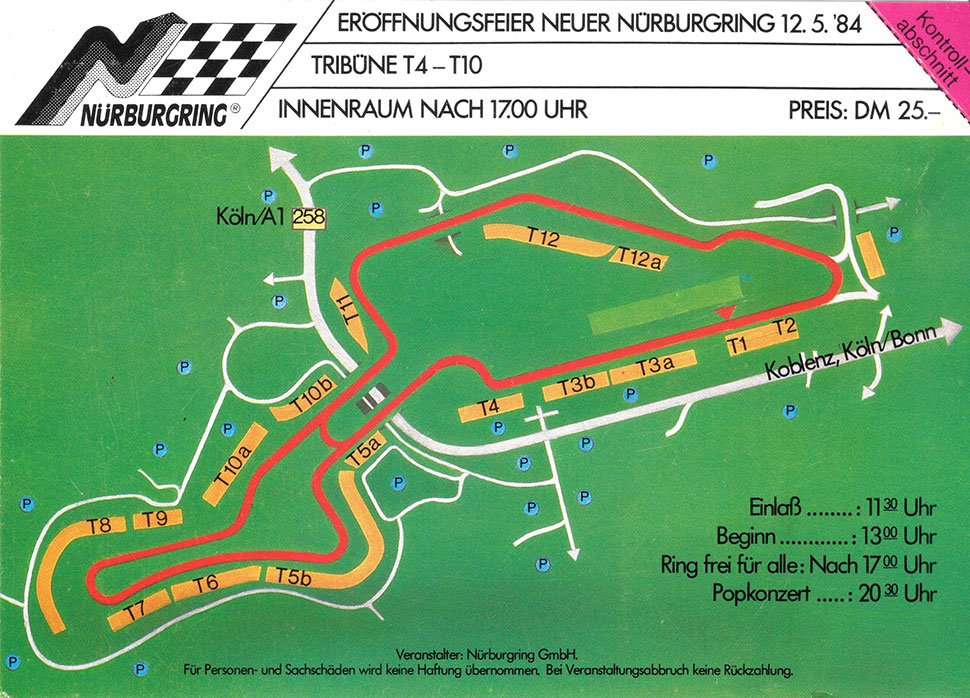 Die Eintrittskarte zur Eröffnungsfeier am 12. Mai 1984. Zu erleben gab es für die Besucher unter anderem das Eröffnungsrennen – mit dem Brasilianer Ayrton Senna als Sieger.