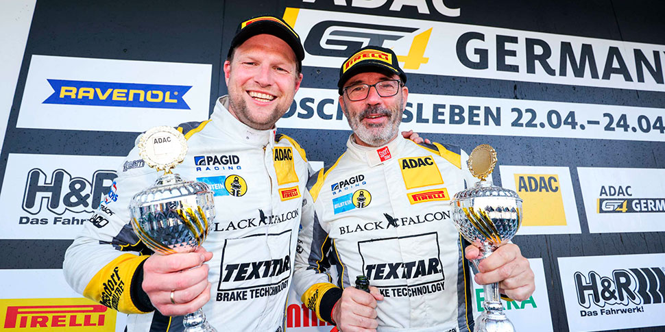 Das BLACK FALCON Team TEXTAR absolvierte in Oschersleben den Saisonauftakt der ADAC GT4 Germany. Axel Sartingen und Daniel Schwerfeld starteten im Porsche Cayman GT4 RS Clubsport mit der Startnummer 33 in der Trophy-Wertung. Beim ersten Rennen am Samstag kämpfte sich das Duo mit einer starken Aufholjagd von Klassenrang vier bis auf Platz zwei in der Trophy-Wertung nach vorne und feierte damit einen gelungenen Saisonauftakt. Beim zweiten Rennen am Sonntag verteidigten Sartingen und Schwerfeld die zweite Startposition und überquerten die Ziellinie zunächst auf Rang zwei in der Klasse. Nach Rennende erhielt das Team jedoch eine 30-Sekunden-Strafe für eine Kollision in der zweiten Rennhälfte, sodass man schließlich auf dem vierten Rang in der Trophy-Wertung gewertet wurde.