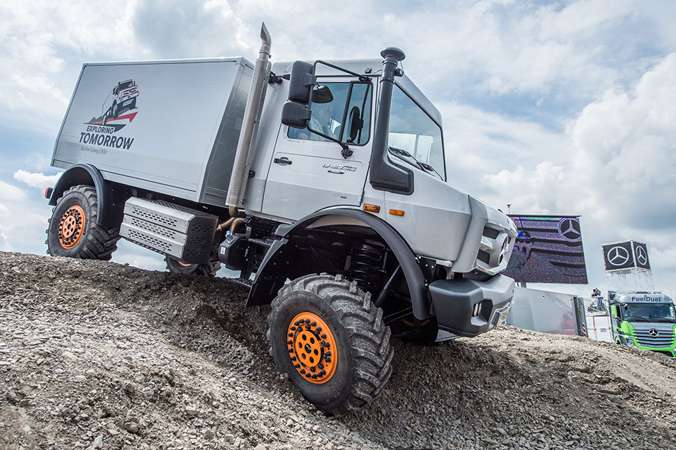 Auf einer Fläche von rund 2.000 qm boten sich den Besuchern spektakuläre fahr­dynamische Aktionen. Insgesamt fanden 17 Shows von Freitag bis Sonntag statt. Hier konnten die Besucher Mercedes-Benz Fahrzeuge vom Actros HAD über den Unimog bis hin zum Sprinter 4x4 bestaunen. Ein Oldtimer wurde vorgeführt und auch den Spritsparmeister Actros vom Kraftstoffwettbewerb FuelDuel konnten die Besucher live bewundern. Der Actros tritt in Fremdfuhrparks zwei Wochen gegen den kraftstoffärmsten Lkw des jeweiligen Fuhrparks an und fährt die gleichen Touren. Bis heute wurden europaweit 1.209 FuelDuel durchgeführt, 6.015.035 km im Einsatz gefahren und eine durchschnittliche Kraftstoffeinsparung von 10,2 Prozent weniger Diesel eingefahren. Mercedes-Benz Lkw sind aber nicht nur kraftstoffsparend, sondern auch umweltfreundlich unterwegs. Der ausgestellte Actros 1842 belegte in diesem Jahr als umweltfreundlichster Lkw den ersten Platz beim Green Truck Award und punktete im Wettbewerbsvergleich mit dem geringsten Kraftstoffverbrauch.