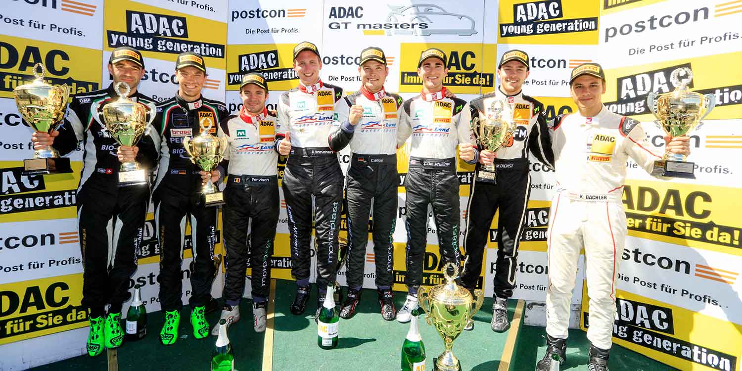 Die Titelverteidiger Luca Ludwig (27, Bonn)/Sebastian Asch (30, Ammerbuch/beide AMG-Team Zakspeed) überquerten die Ziellinie auf Rang fünf. Das zweite Mal in die Punkte in dieser Saison fuhr der Audi R8 von Peter Hoevenaars (21, NL)/Frédéric Vervisch (30, B/beide Montaplast by Land-Motorsport), die Rang zwei in der Junioren-Wertung belegten. Wie schon im Samstagsrennen verbuchten Rolf Ineichen (38, CH)/Christian Engelhart (29, Kösching/beide GRT Grasser-Racing-Team) im Lamborghini Huracán auch am Sonntag nach Rang sieben ein gutes Resultat. Ineichen gewann erneut die Trophy-Wertung.