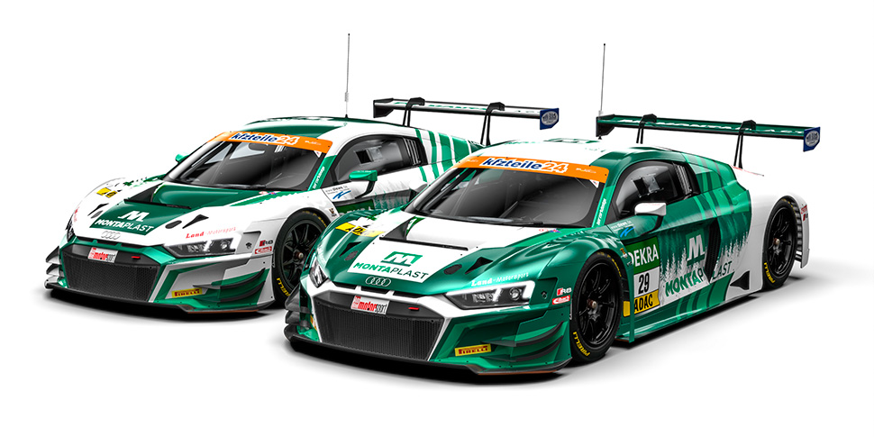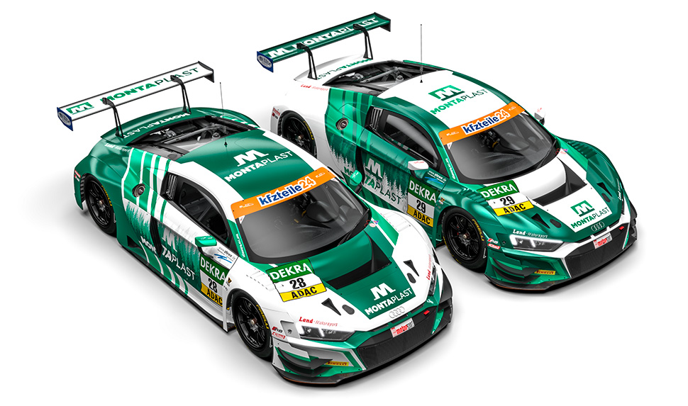 Die beiden Audi R8 von Montaplast by Land-Motorsport erhalten für die Saison 2019 nicht nur den von Audi neu entwickelten Evo-Kit, sondern auch ein frisches Design. Die Beklebung ist zwar weiterhin im typischen Weiß-Grün gehalten, wurde aber neu entworfen.