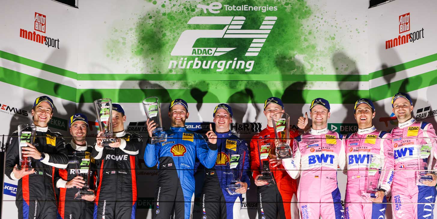 Kurz vor dem Schluss des Rennens wurde es noch einmal spannend: Nachdem nur zu Beginn der Drei-Stunden-Distanz wenige Meter Nordschleife feucht waren, blieben die vorausgesagten Schauer danach aus. Knapp 20 Minuten vor der Zielflagge ließ ein Regenschauer dann doch noch einige Teilnehmer ins Aus rutschen – ohne schwerere Zwischenfälle. Feucht wurde es auch bei den Junioren von BMW, die reichlich Siegersekt verschütten konnten. „Wir sind super zufrieden. Jetzt einen Platz besser als noch beim vergangenen Rennen. Der BMW funktioniert super und wir freuen uns schon auf morgen.“ sagte Max Hesse. Für die Zweitplatzierten resümierte Philipp Eng: „Das ganze Rennen war sehr eng, speziell am Start mit Neil. Aber es hat perfekt funktioniert. Das Auto war tip top und wir fühlen uns gut vorbereitet. Das Rennen hat viel Spaß gemacht. Natürlich kann man immer noch etwas verbessern. Das neue Format mit zwei Rennen ist wirklich cool, zumal wir heute die Möglichkeit hatten auch mal im Dunkeln zu fahren“.