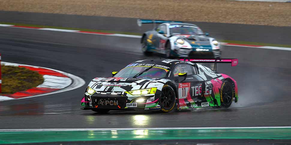 Pünktlich zum Rennstart am Samstagmittag öffnete der Himmel erneut seine Schleusen. Startfahrer Pierre Kaffer spielte jedoch seine ganze Routine aus und konnte den Audi R8 LMS sicher durch die hektische Anfangsphase bringen. Seine Teamkollegen Elia Erhart, Simon Reicher und Jan-Erik Slooten taten es in ihren Folgestints dem 24h-Vorjahressieger gleich, bis die Rennleitung um 22.30 Uhr dem Treiben mit der roten Flagge ein vorzeitiges Ende setzte. Nachdem der Regen in der Dunkelheit noch einmal stark zugenommen hatte, wurde aus Sicherheitsgründen eine 9,5h Pause eingelegt.