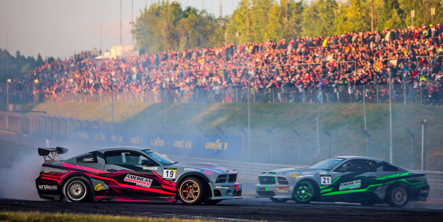 Zu den Publikumslieblingen gehörte aber auch das Ehepaar Michael und Romy Zavelberg, die nur wenige Kilometer vom Ring entfernt beheimatet sind. Mit zwei verschiedenfarbig lackierten Ford Mustangs zeigten sie dem lautstark applaudierenden Publikum eindrucksvoll, dass sie nicht nur privat, sondern auch auf der Strecke „Seite an Seite“ durchs Leben gehen - beziehungsweise driften.