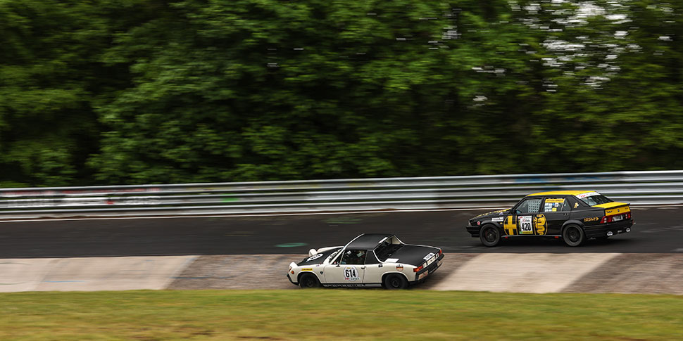 Mit leichtem Regen und kühlen zwölf Grad zeigte die Eifel nicht gerade ihr sonniges Gesicht beim Start. Trotz der leicht rutschigen Bedingungen machten sich die drei Startgruppen ohne Zwischenfälle auf den Weg. Ihre Pole Position nicht in die Führung umsetzen konnten Jürgen und Peter Schuhmann sowie Olaf Manthey, Ihr #508 BMW 635 CSI kam beim Start nicht gut vom Fleck.
