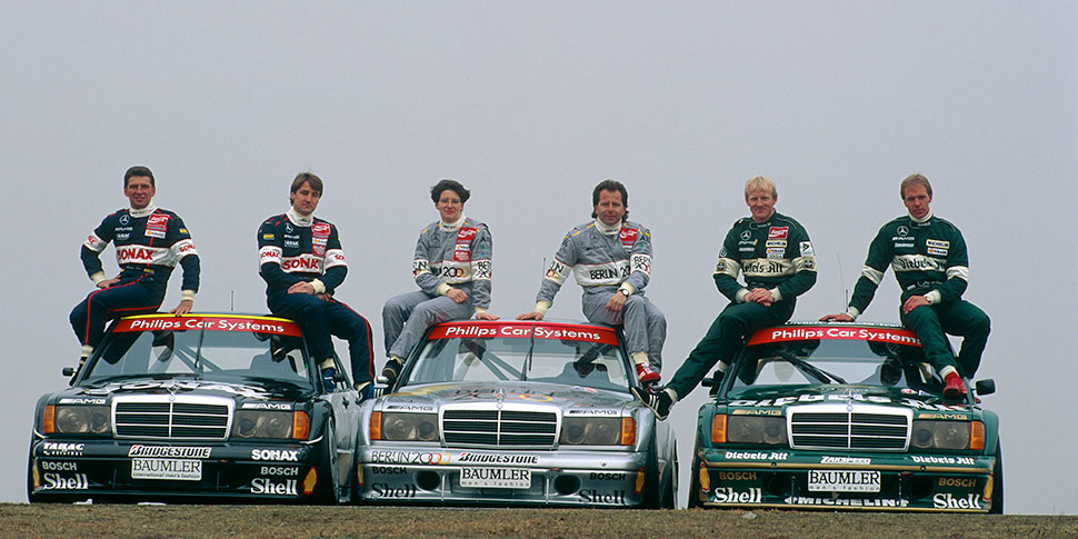 Titelbild: Rennfahrerin Ellen Lohr (3. von links) mit ihren Mercedes-Benz Mannschaftskollegen und Mercedes-Benz 190 E 2.5-16 Evolution II Rennsport-Tourenwagen in der DTM-Saison 1993