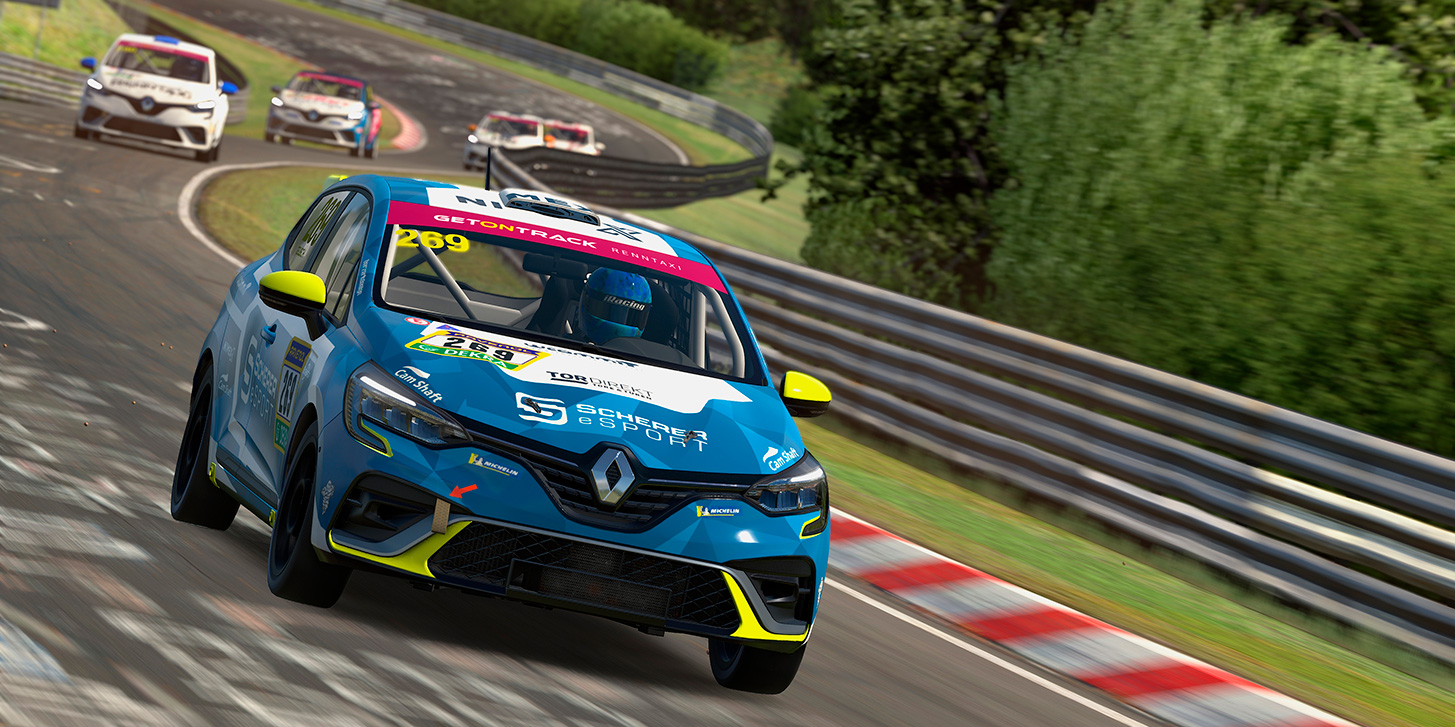 Der Premierensieg des Renault Clio in der SP3 ging an Sven Winter und Michael Teisch von SCHERER eSPORT. Das Duo setzte sich gegen Leon Harhoff und Lean Weigel von smillaesports x Entropy sowie Christopher Limprecht und Merlin Marc Wolf von Wollf Motorsport Simracing durch. „Das hat heute Megaspaß gemacht“, sagte Teisch. „Wir hatten ein bisschen Pech, weil wir in der ersten Runde einen Treffer abbekommen haben und unser Lenkrad seitdem schief stand. Die Pace hat dies zum Glück nicht beeinflusst.“ Die große Herausforderung in der kleinsten DNLS-Klasse ist – wie auch im Multiclass-Racing der realen NLS – den Verkehr bestmöglich zu lesen und sich trotzdem auf sein Rennen zu konzentrieren. Teisch erklärt: „Es ist immer spannend, wenn ein D-Zug an Cup-Porsche oder so an dir vorbeifliegt. Man muss vorsichtig fahren, aber nicht zu sehr, um für den überrundenden Fahrer einschätzbar zu bleiben. Das ist mit dem Clio nicht ganz einfach, weil man auf der Nordschleife extrem viel Vollgasanteil hat und gerade im direkten Duell in der Klasse nie den Windschatten abreißen lassen darf.“