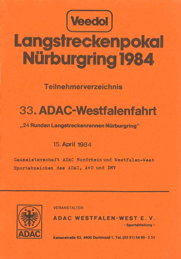 Die 33. ADAC-Westfalenfahrt, der erste Lauf zum Veedol-Langstreckenpokal Nürburgring 1984, fand unter besonderen Bedingungen statt. Ein plötzlicher Wintereinbruch wenige Tage vor dem Rennen hatte die Nürburgring GmbH vor große Herausforderungen gestellt. Nur mit Mühe konnten die letzten Schneereste beseitigt werden, um den Rennbetrieb zu sichern. Zwei weitere Läufe sollten noch auf der alten Nordschleife gefahren werden, bevor auch die Langstrecken-Spezialisten die neue Grand-Prix-Strecke in Besitz nehmen würden.