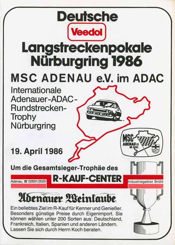 Mit einem dramatischen Rennen voller Wetterkapriolen, einer wahren Rekordkulisse und spannungsgeladenen Positionskämpfen ging der dritte Lauf der Deutschen Veedol-Langstreckenpokale Nürburgring 1986 über die Bühne. Bei der 17. Adenauer ADAC Rundstrecken Trophy stellte der MSC Adenau einen neuen Meilenstein auf: 184 Nennungen und schließlich 171 Fahrzeuge auf der Strecke bedeuteten eine neue Bestmarke für das Langstreckenrennen in der Grünen Hölle.