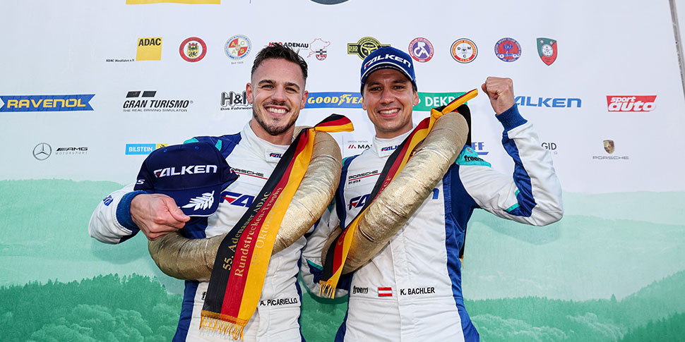 Der Sieg von Bachler und Picariello bei der 55. Adenauer ADAC Rundstrecken-Trophy war alles andere als ein Spaziergang. Bei kalten und nassen Bedingungen im Qualifying fuhr Bachler zunächst die Bestzeit, ehe er mit dem Falken-Elfer von der Strecke abkam und in die Streckenbegrenzung einschlug. Das Falken-Team nutzte die Pause bis zum Rennen, um das Fahrzeug instand zu setzen. Als letztes Fahrzeug rollte der Elfer gerade noch rechtzeitig auf seinen Startplatz mit Bachler am Steuer. Diese Position verteidigte er vier Runden lang. Weil das GPS-System infolge der Reparatur nicht ordnungsgemäß funktionierte, wurde Falken von der Rennleitung mit der sogenannten ‚Spiegelei-Flagge‘ an die Box beordert. Bei dem unplanmäßigen Stopp entschied sich das Team zu einem mutigen Reifenwechsel: Bachler setzte als erster Fahrer auf Slicks. Auch wenn die ersten Meter diffizil waren, fuhr er sich so einen Vorsprung heraus. Beim nächsten Stopp übernahm Picariello das Volant und hatte im Metzgesfeld ebenfalls Kontakt mit der Leitplanke. Die Beschädigungen beeinträchtigten die Rennspeed nicht und er setzte die Fahrt bei wechselnden Witterungsbedingungen fort.