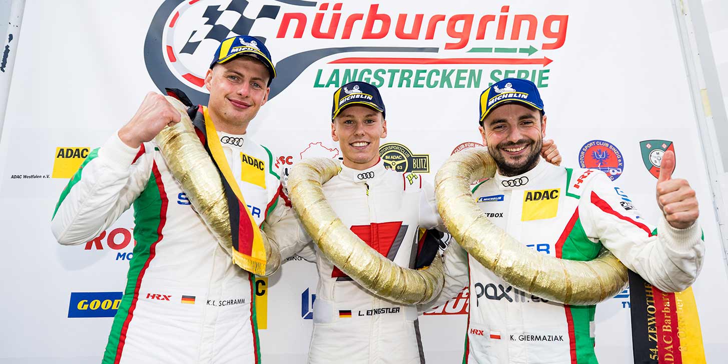Zwei Fahrzeuge, ein Team: Die beiden Audi R8 LMS GT3 EVO II des Scherer Sport Team Phoenix machten den Sieg beim 54. ZEWOTHERM ADAC Barbarossapreis unter sich aus. Jakub „Kuba“ Giermaziak, Kim Luis Schramm und Luca Engstler gewannen Rennen sechs der Nürburgring Langstrecken-Serie nach vierstündiger Renndistanz mit einem Vorsprung von 21,649 Sekunden vor den Teamkollegen Frank Stippler und Vincent Kolb. Einen fantastischen Einstand feierten Julien Andlauer und Frédéric Makowiecki bei der Weltpremiere des neuen Porsche 911 GT3 R: Sie belegten beim ersten Renneinsatz des neuen 911er Platz drei.
