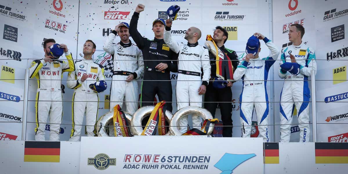 Vier Piloten strahlten am Ende des ROWE 6 Stunden ADAC Ruhr-Pokal-Rennens mit der Sonne um die Wette. Hubert Haupt, Adam Christodoulou, Manuel Metzger und Gabriele Piana fuhren beim Saisonhöhepunkt der VLN den ersten Mercedes-AMG-Sieg 2018 ein. Von der Pole-Position aus gestartet ließ das Black-Falcon-Quartett zu keinem Zeitpunkt etwas anbrennen und setzte sich nach 42 Runden – umgerechnet 1023,036 Kilometern – mit einem souveränen Vorsprung von 1:53,266 Minuten gegen die Verfolger durch. In einem spannenden Finish hatte ROWE RACING mit den Fahrern Philipp Eng und Tom Blomqvist im #99 BMW M6 GT3 gegen die Markenkollegen von Falken Motorsport die Nase vorne. Stef Dusseldorp und Alexandre Imperatori fehlten auf Platz drei nur 11,136 Sekunden auf Rang zwei.