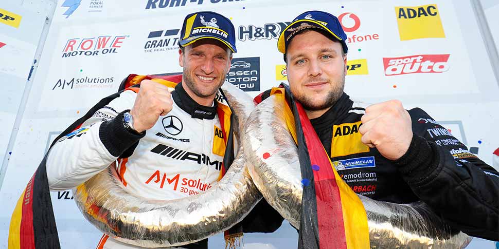 Strahlende Sieger auf dem Podium: Maro Engel und Patrick Assenheimer (Mercedes-AMG GT3)