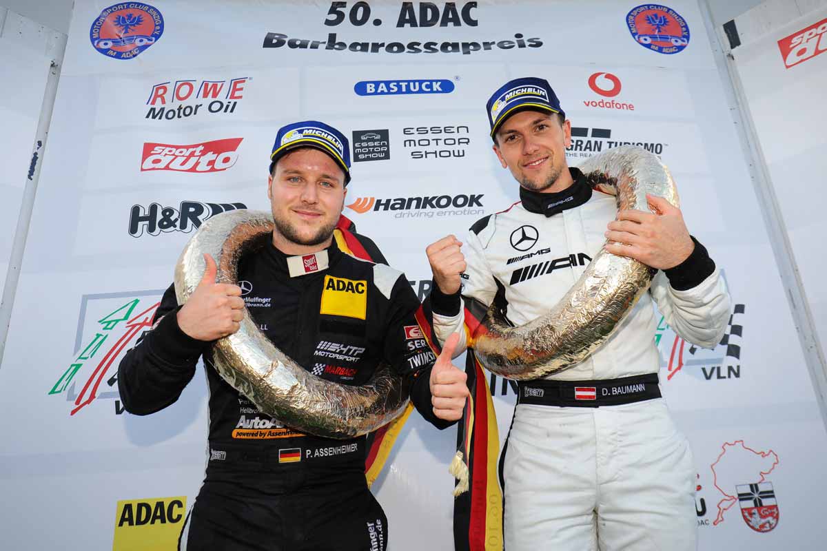 Großer Jubel auf dem Siegerpodest: Das Team AutoArena Motorsport feierte beim 50. ADAC Barbarossapreis den ersten VLN-Triumph. Patrick Assenheimer und Dominik Baumann überquerten im Mercedes-AMG GT3 nach 28 Runden mit einem knappen Vorsprung von 3,651 Sekunden als Sieger die Ziellinie. Für beide Fahrer war es ebenfalls der erste VLN-Erfolg. Das Team SPS automotive performance verpasste bei seinem VLN-Debüt die Sensation nur knapp. Über weite Strecken hatten Edoardo Mortara und Renger van der Zande im Mercedes-AMG GT3 das Rennen angeführt. Am Ende kostete sie ein kleiner Fehler den Sieg. Platz drei beim achten Saisonrennen ging an Jonathan Hirschi, Jordan Tresson und Hunter Abbott im BMW M6 GT3 von Walkenhorst Motorsport.