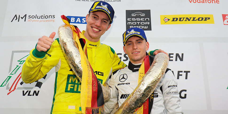 „Ich freue mich riesig über meinen ersten VLN-Sieg. Und das HTP-Team hat sich den Erfolg auch redlich verdient, nachdem wir auf der Nordschleife in diesem Jahr sehr viel Pech hatten“, sagte Buhk. „Im Rennen hat Raffaele es mir sehr einfach gemacht. Er ist zu Beginn zwei fantastische Stints gefahren, so dass ich den Sieg nur nach Hause fahren musste. Jetzt freue ich mich auf mein erstes Rennen im neuen Mercedes-AMG GT3 in zwei Wochen.“ Die Vorfreude ist berechtigt, schließlich erlebten Yelmer Buurman und Luca Stolz eine problemlose Premiere des neuen GT3-Renners aus Affalterbach. Das Fahrzeug befindet sich derzeit in der finalen Testphase vor der Auslieferung im kommenden Jahr und verfügt noch nicht über eine GT3-Homologation. Aus diesem Grund starteten Buurman und Stolz in der Klasse SPX. Gemäß Reglement betrug die Mindestboxenstoppzeit jeweils 30 Sekunden länger als normal und das Rennen musste vom letzten Platz der ersten Startgruppe aufgenommen werden. Black Falcon zeichnete für den ersten Einsatz verantwortlich, beim VLN-Finale in zwei Wochen ist dann das Team HTP-Motorsport dann am Zug.
