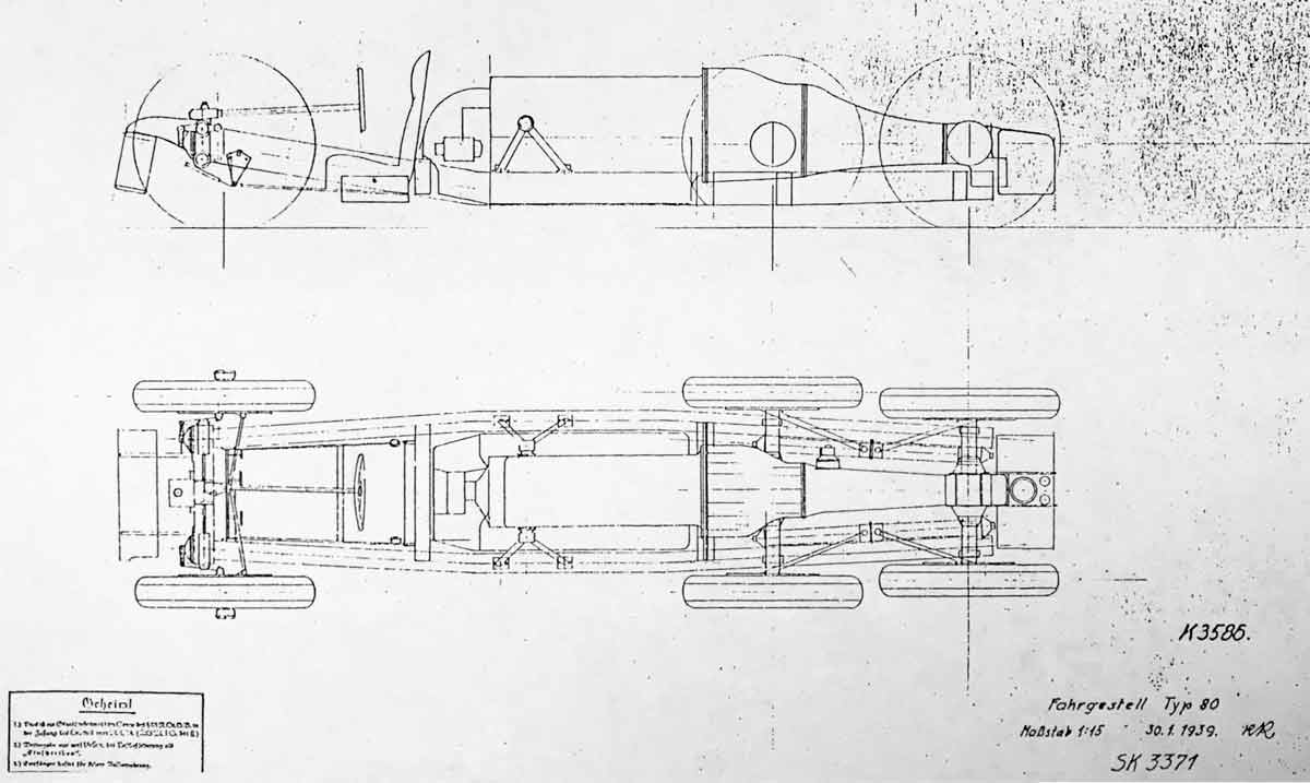 Porsche entwirft ein von einem Flugmotor angetriebenes Fahrzeug mit drei Achsen. Die Radstände betragen 3.550 und 1.280 Millimeter (Abstand von der Vorderachse zur vorderen Hinterachse sowie zwischen den beiden Hinterachsen). Der Motor ist vor der ersten Hinterachse hängend eingebaut. Er überträgt seine Kraft auf die beiden als Pendelachsen ausgelegten hinteren Achsen. Auf ein Getriebe verzichten die Konstrukteure wegen des hohen Drehmoments. Stattdessen kommt eine Sechsscheiben-Wärmespeicherkupplung mit automatischer Fliehkraftanpassung zum Einsatz. Ein innovatives Detail ist auch der Drehzahlangleicher. Heute würde man ihn als Antriebs-Schlupf-Regelung bezeichnen. Das mechanische System verhindert beim Anrollen des Fahrzeugs wirksam Schlupf an den Hinterachsen und trägt so zur Reifenschonung bei.